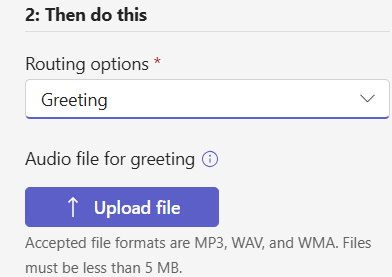 The third option is a voice application, which is usually an Auto Attendant or Call Queue. If the first option of playing a greeting and disconnecting doesn’t work for you, you can use this option to send calls to an Auto Attendant, play a greeting (including text to speech) and then take some other action – let callers select from a menu of other options to handle their call.