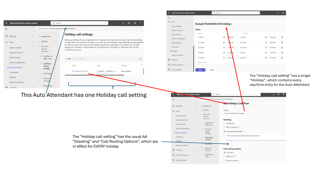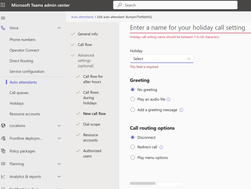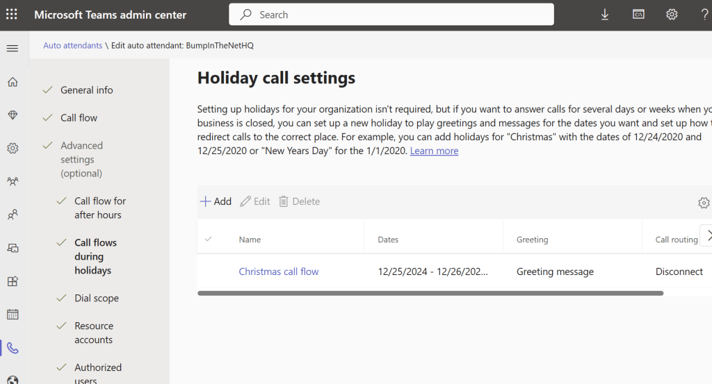 Let’s just back to the “BumpIntheNetHQ” prefix on all of my holidays to reinforce that – every Auto Attendant will have an option to pick any existing Holiday that’s defined in a tenant. Starting the name of the Holiday with the name of the Auto Attendant that it applies to, or the department or team or whatever if there are multiple AAs that share the same exact Holiday set, will prevent a lot of grief.