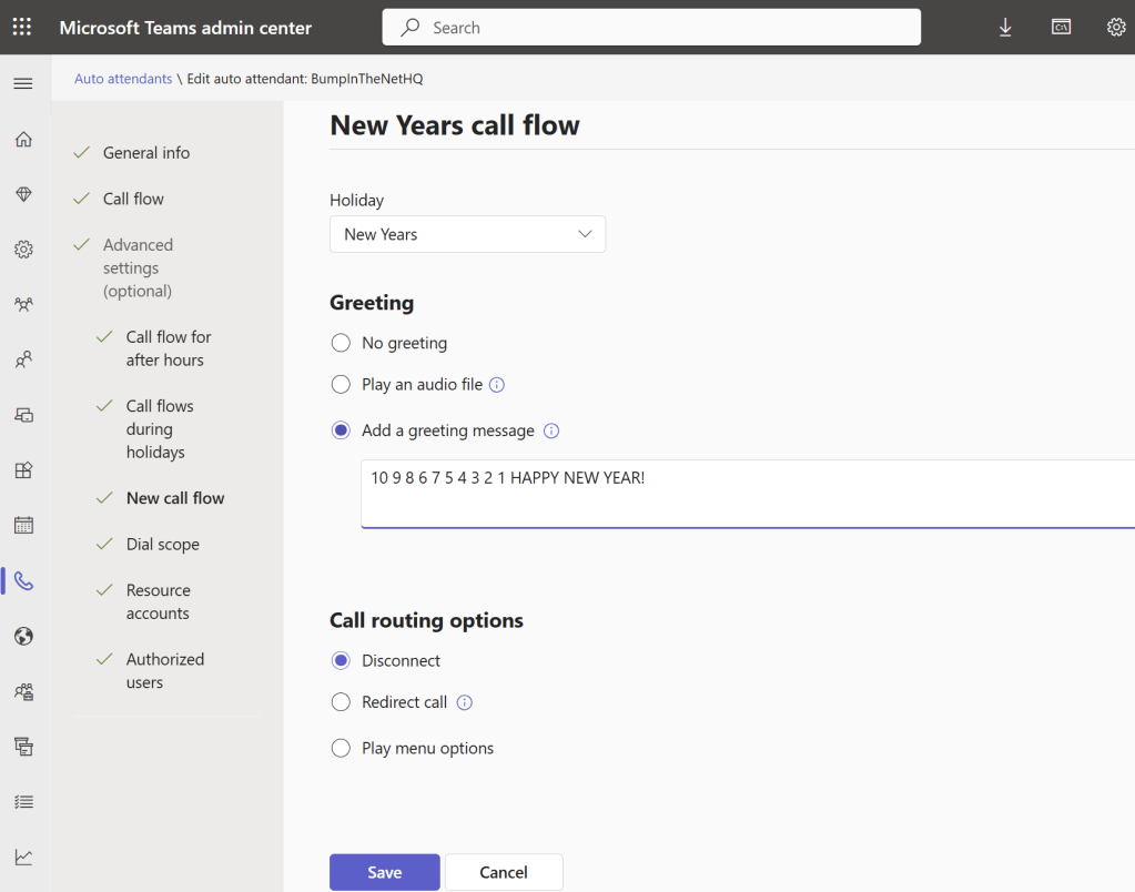 Eagle-eyed readers will have spotted the “BumpinTheNetHQ All Holidays” Holiday. Above, we have different call handling for our Christmas (Ba Humbug!) and New Years (the countdown message) Holidays. This is very flexible for different greetings and handling if that’s desired for your Holidays. However, if you don’t differentiate between Holidays with how they’re handled – say you just play a “we’re closed for the holiday, please leave a message and we’ll get back to you” greeting and dump the caller into voicemail for every Holiday – you would wind up having to manually duplicate (or dive into PowerShell) all of your call flow options. I’m using simple greetings and “disconnect” as an example here, but if you have a number of options “Press 1 for xxx, Press 2 for yyy…” that’s a lot of work to create and maintain.