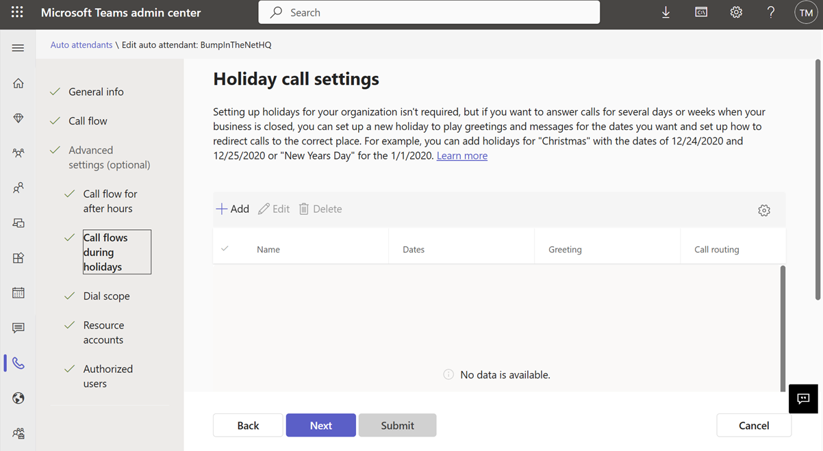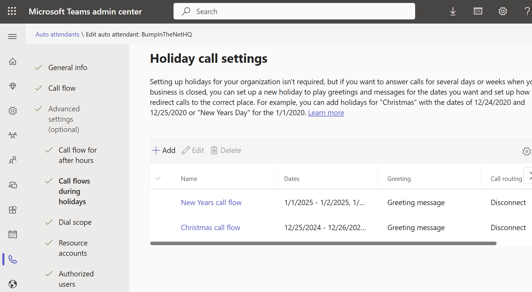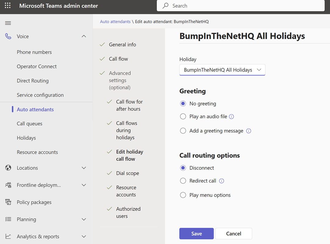 Let’s just back to the “BumpIntheNetHQ” prefix on all of my holidays to reinforce that – every Auto Attendant will have an option to pick any existing Holiday that’s defined in a tenant. Starting the name of the Holiday with the name of the Auto Attendant that it applies to, or the department or team or whatever if there are multiple AAs that share the same exact Holiday set, will prevent a lot of grief.
