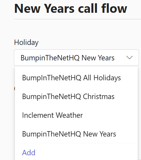 Eagle-eyed readers will have spotted the “BumpinTheNetHQ All Holidays” Holiday. Above, we have different call handling for our Christmas (Ba Humbug!) and New Years (the countdown message) Holidays. This is very flexible for different greetings and handling if that’s desired for your Holidays. However, if you don’t differentiate between Holidays with how they’re handled – say you just play a “we’re closed for the holiday, please leave a message and we’ll get back to you” greeting and dump the caller into voicemail for every Holiday – you would wind up having to manually duplicate (or dive into PowerShell) all of your call flow options. I’m using simple greetings and “disconnect” as an example here, but if you have a number of options “Press 1 for xxx, Press 2 for yyy…” that’s a lot of work to create and maintain.