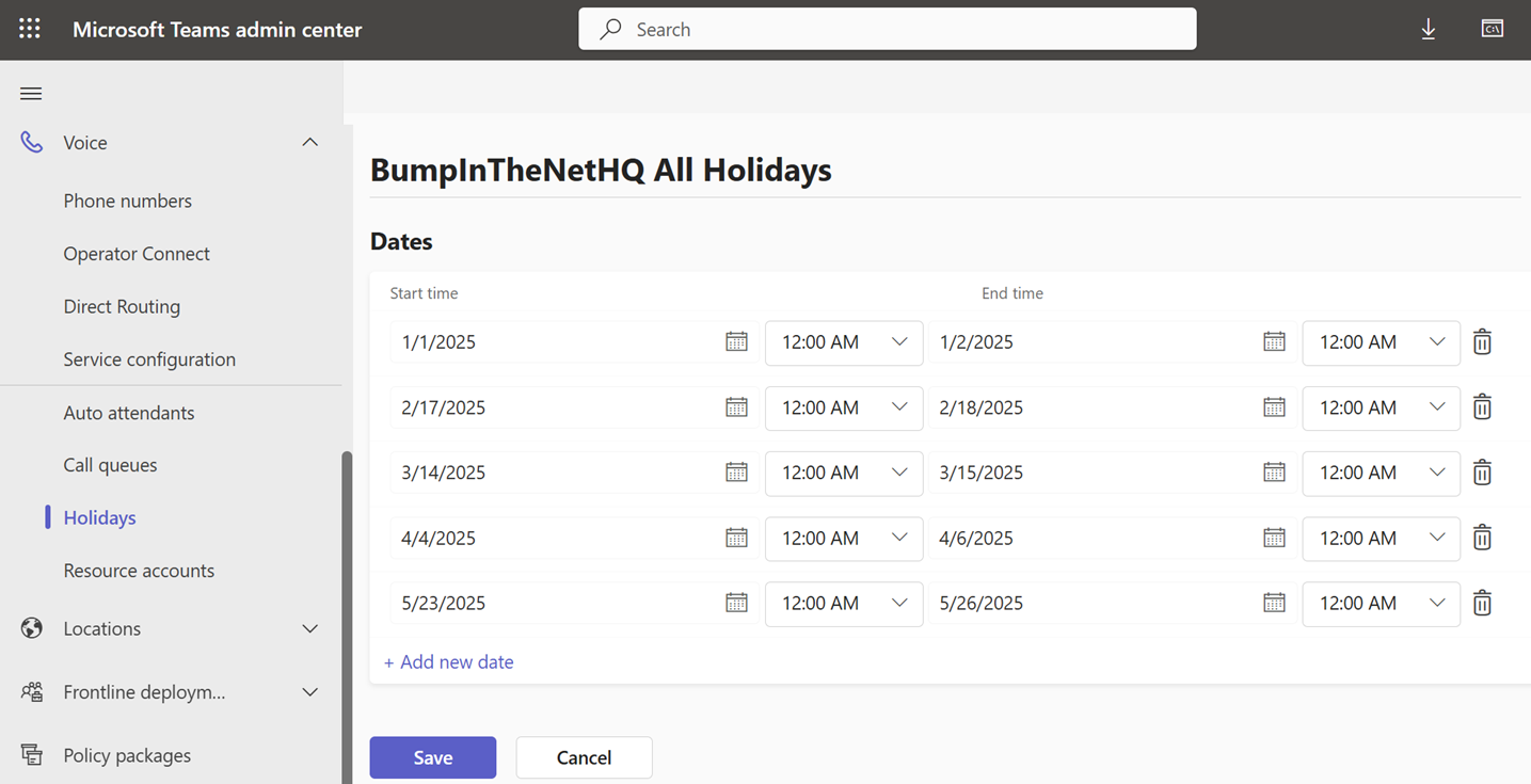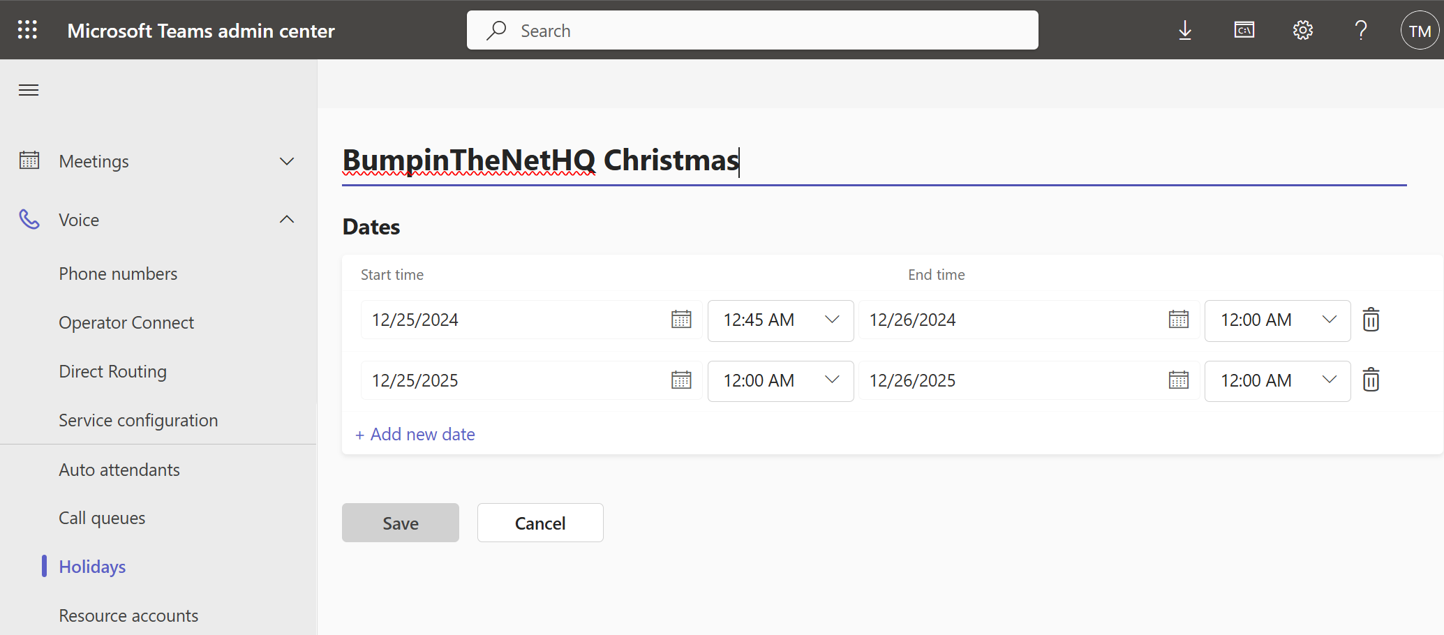 You can better administer Holidays through the Holiday section of the Voice menu on the left menu. Here we can see a list of all of the Holidays configured in Teams, plus the start of the dates that are configured for that Holiday. Note that you don’t get to see times here, and a long list of Holiday Dates may not fit on your screen.
