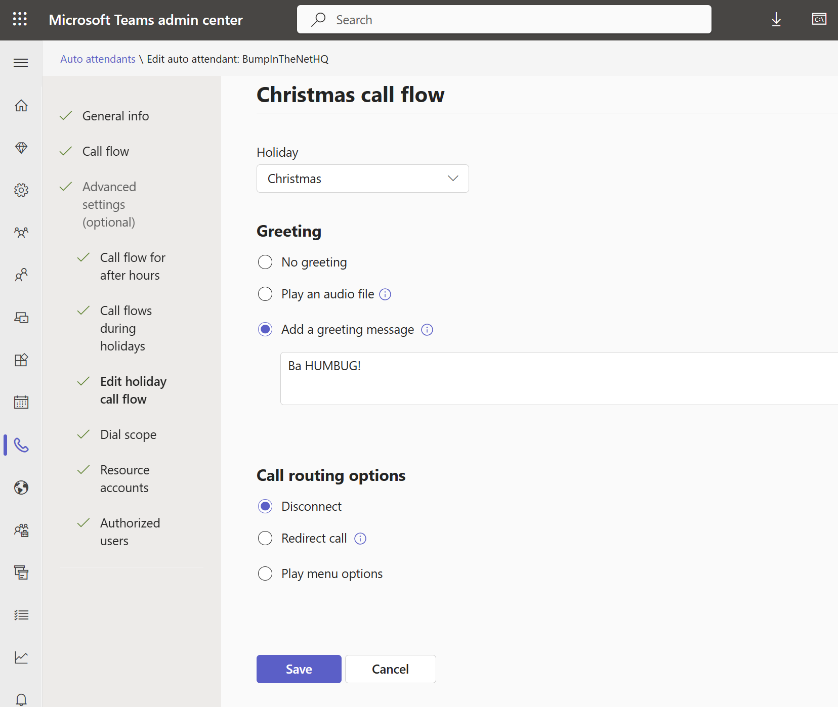 Here I’ve also assigned a “Holiday” called Christmas (more on that later!) and I’ve configured the Auto Attendant to speak “Ba Humbug!” before disconnecting the caller: