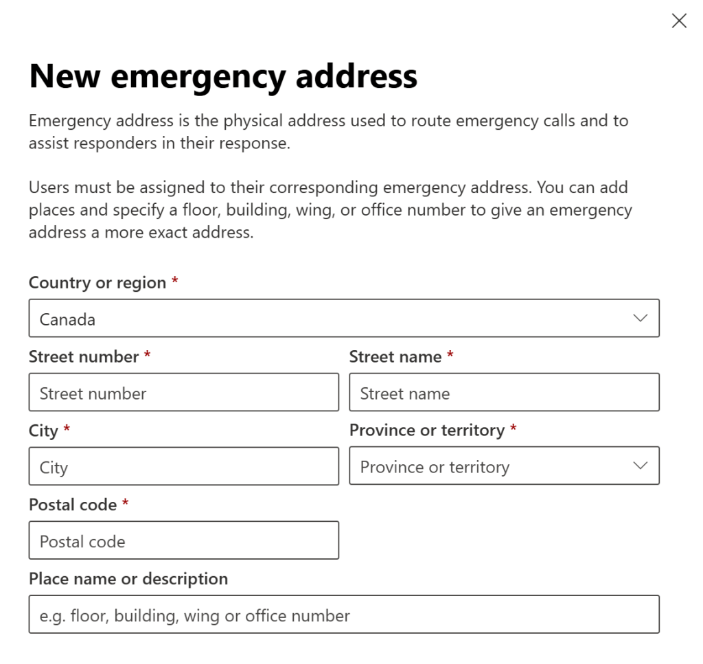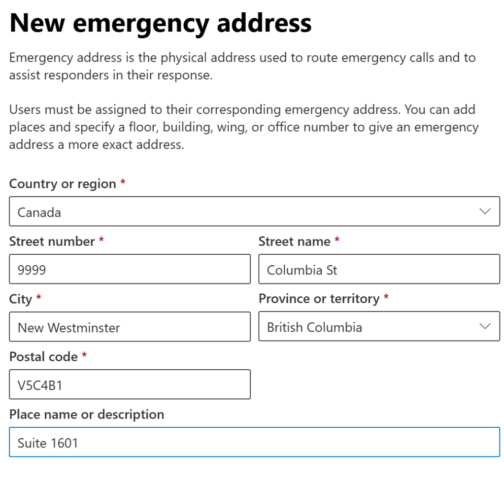 The “Place name or description” isn’t very well described here. Typically this would be a suite or unit number, such as “Suite 1601”. It could also be something like “Council Chambers” or “Electrical room”. It’s the “dispatchable location” that tells the emergency services where to go once they’ve pulled up to the front door. You should only leave this blank if the address provides all of the details needed to reach the location of the caller, such as a small building with just one company in it.