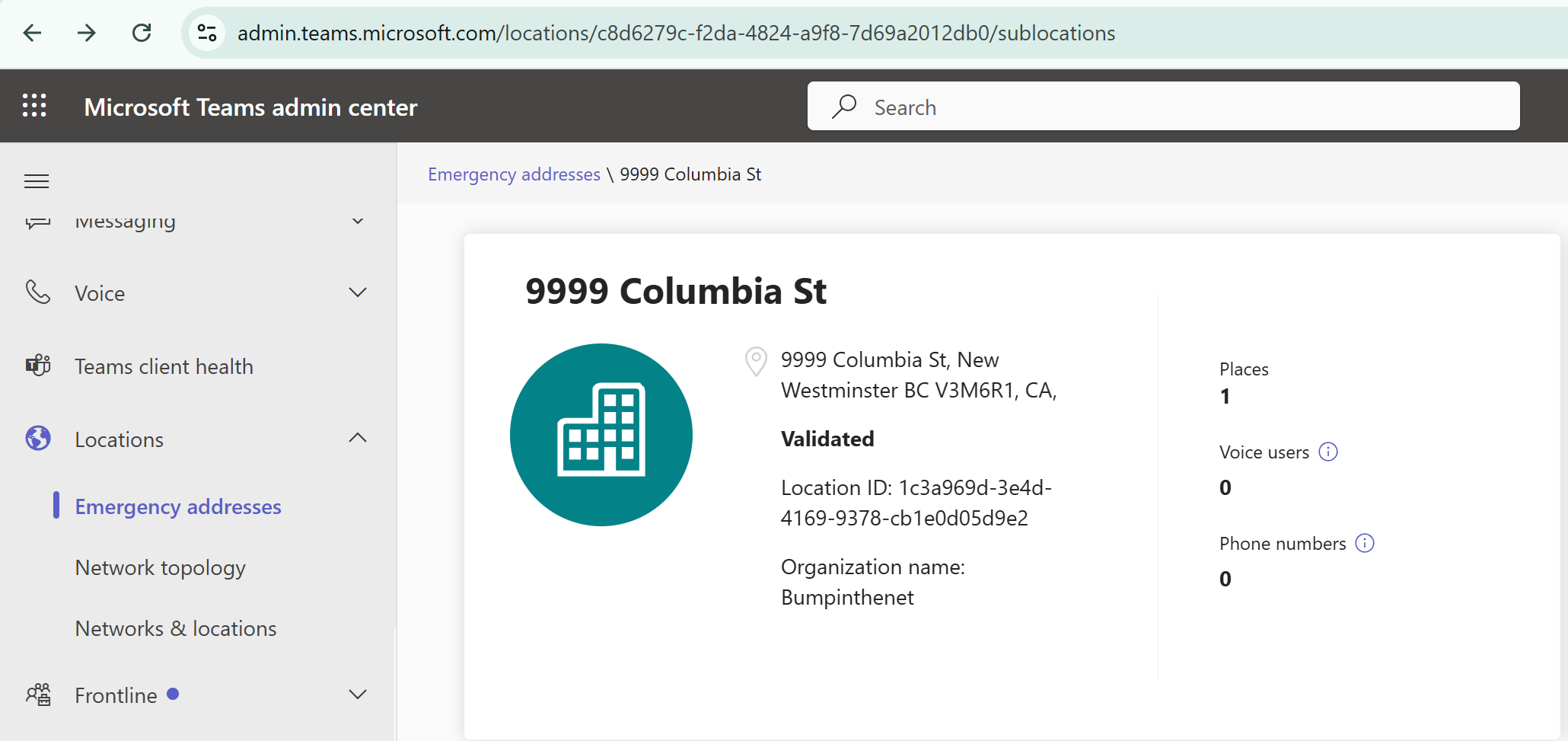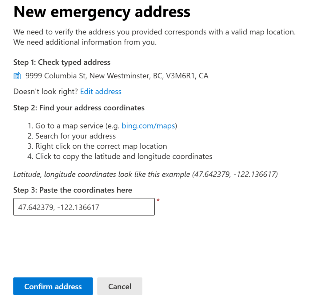 Here’s something to watch for with the process of creating a new Emergency address in this process. If you look at the address in Teams Admin Center after it’s created, you’ll see this: