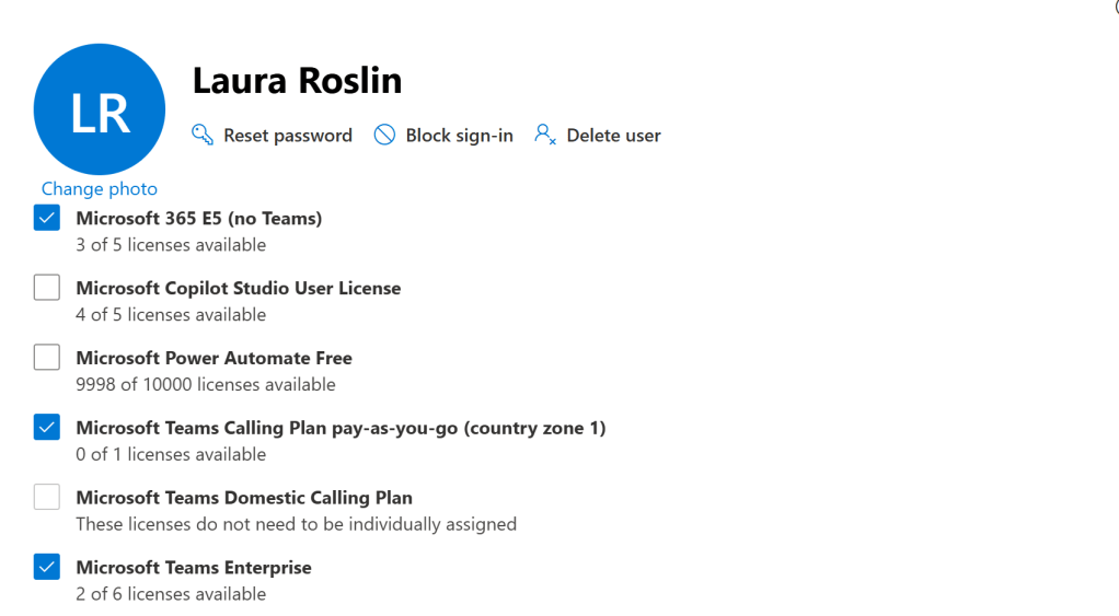 The first step is to license the user. In this case, adding a PAYG Calling Plan: