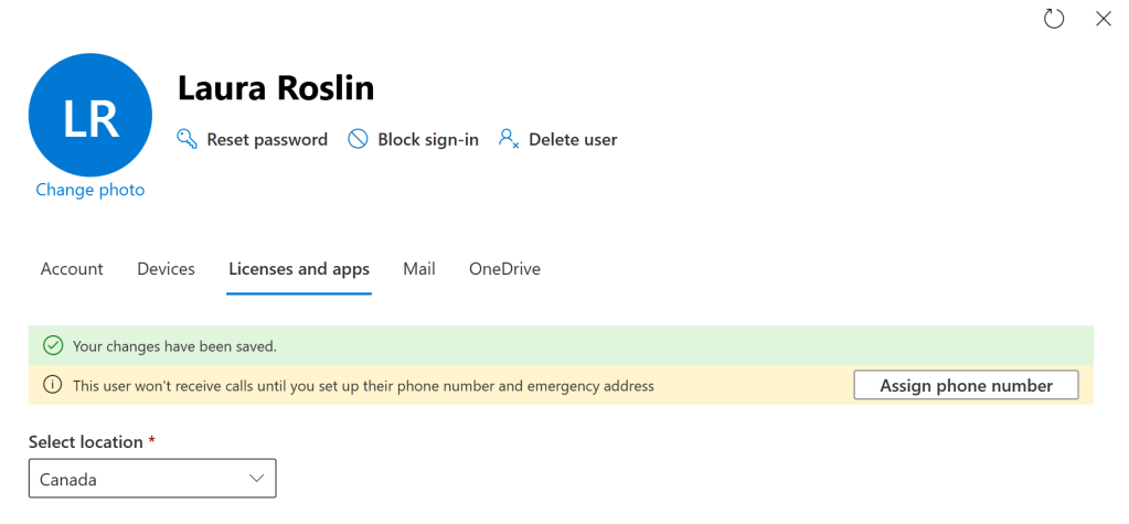 Once that’s done, we get a yellow caution bar advising that they can’t yet make or receive calls. I wish the button on the right used the same language as the text “set up their phone number” vs “assign their phone number”. In any case, click the “Assign phone number” button.