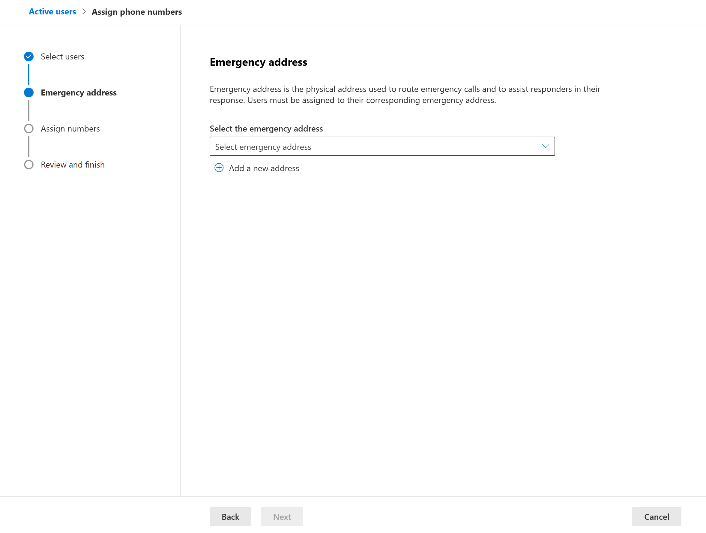 Now we can either select an existing emergency address using the drop down, or we can select Add a new address. Let’s add a new one.