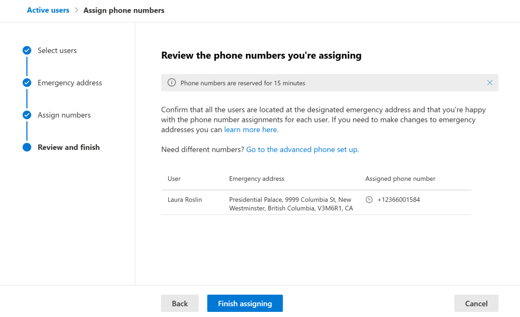 Click Confirm address and then review everything on the next screen. Now you’re offered a phone number to assign to the user. My tenant didn’t have any numbers from that location, so Microsoft is offering one here, they’d held it for 15 minutes. Note that you don’t get to pick your number from Microsoft. If you really, truly need a certain number, your best bet is to acquire it through an existing telco – possibly a mobile provider – and then port it to Microsoft. (But honestly, that’s pretty 1998, isn’t it?)