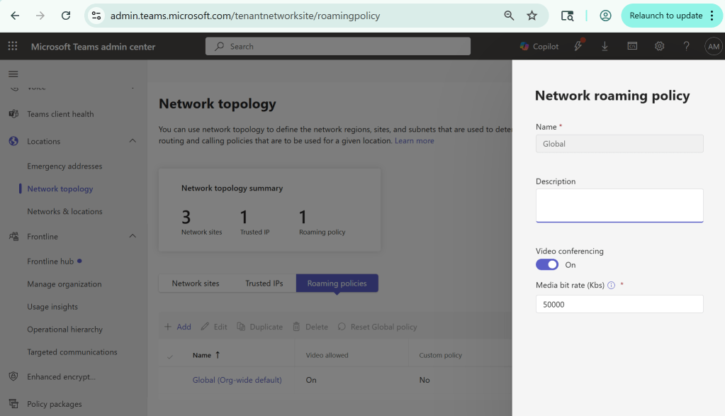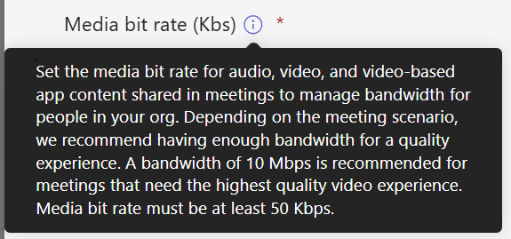The idea behind this policy is that if you have a network site with low available bandwidth, you can restrict the amount that a Teams user’s audio and video can consume when they “roam” to that site. This will scale back resolution, refresh rate, video features, and codecs selected to stay under the cap. When a user “roams” to a different site, this policy no longer applies.