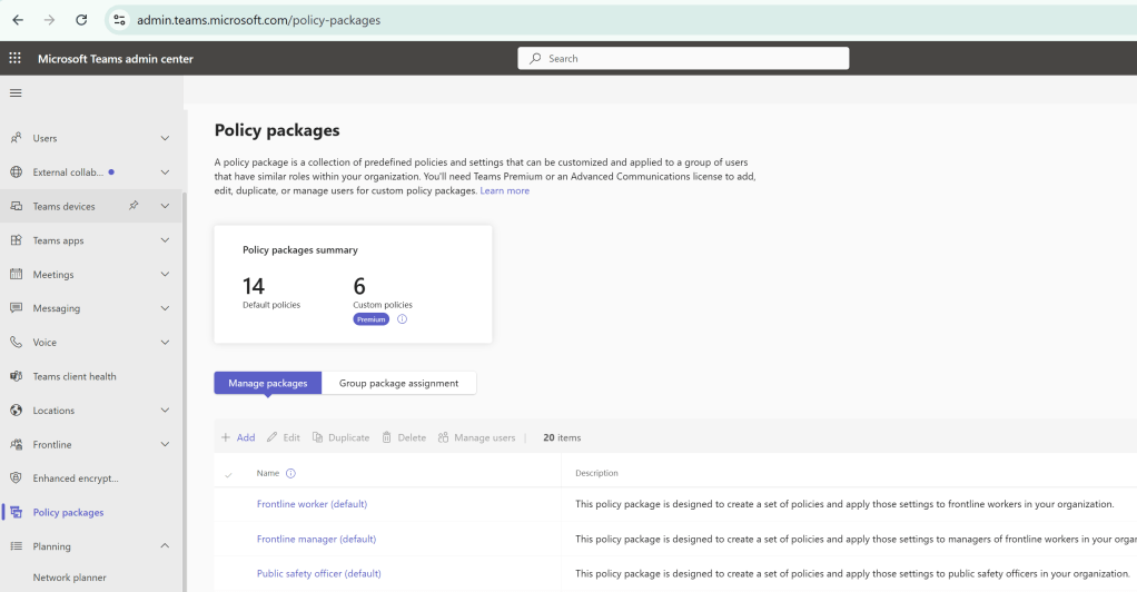 There are two ways of making this easier. The first is Policy Packages. These are a “bundle” of policies that can be assigned versus the individual policies. This helps keep all of the users who need a set of policies aligned with the same policies. I see policy packages used extensively in education and healthcare. Microsoft has a number of policy packages pre-defined: